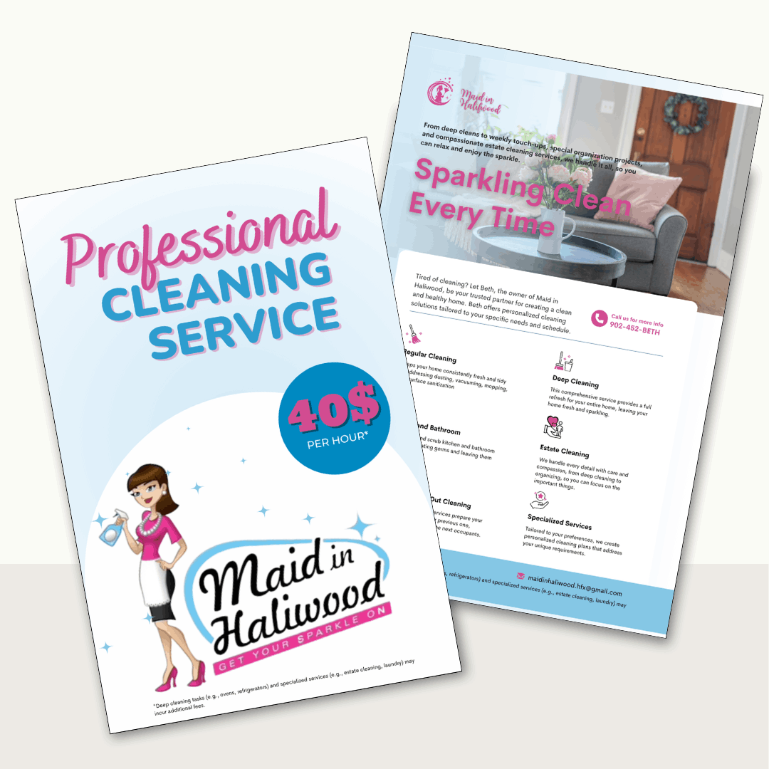 We began by revitalizing her original logo, preserving its essence but adding a touch of modernity and professionalism. The result was a clean, compelling design that truly captured the essence of “Maid In Haliwood.” Next, I crafted eye-catching graphics for her marketing materials, starting with a flyer that showcased her services in a way that stood out. This flyer became her first point of contact with the community—and it made an impression.